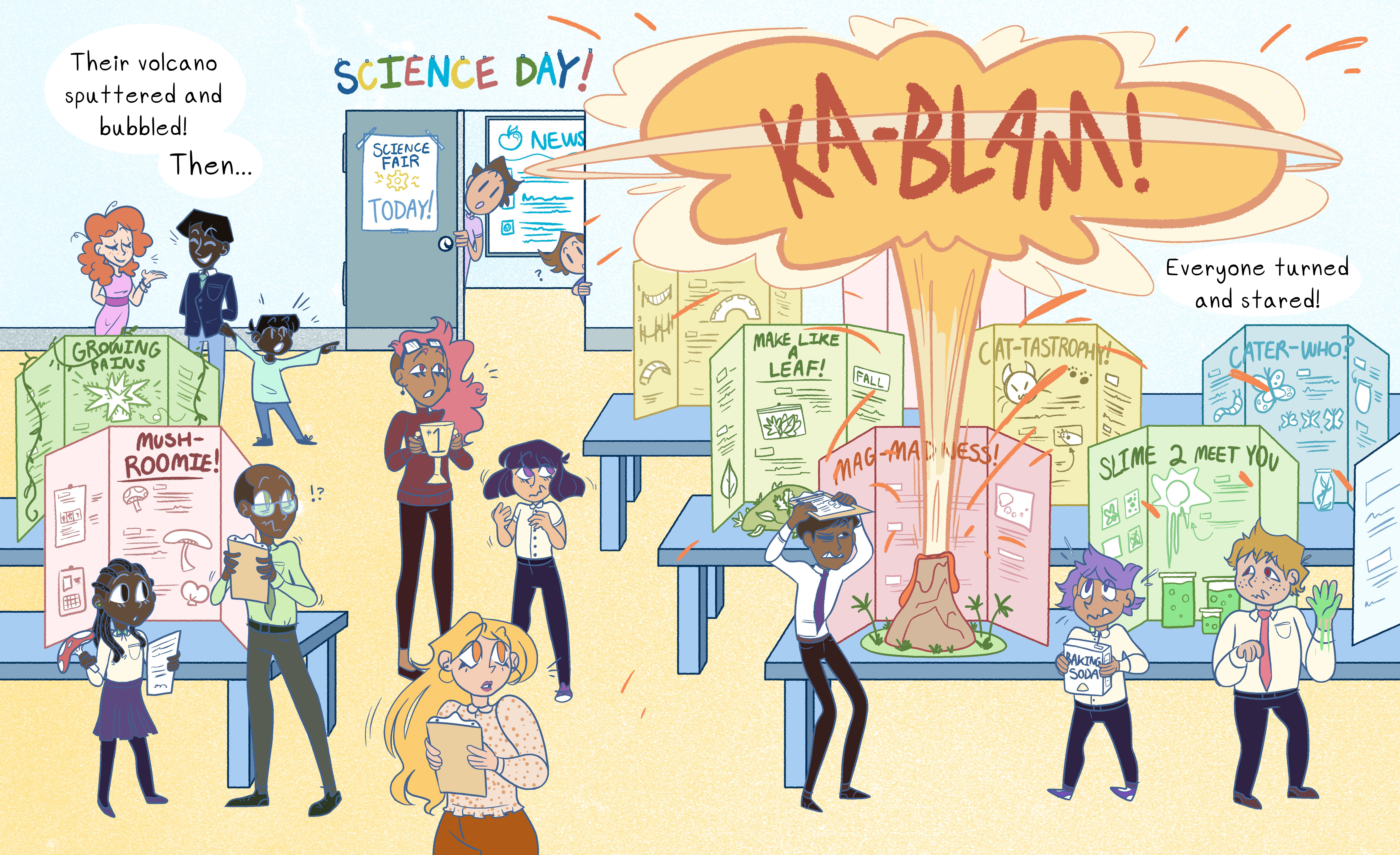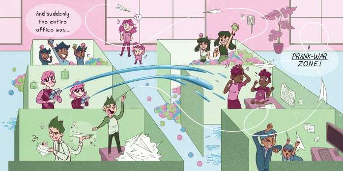This spread is a mock spread idea for a whole children’s book centered around a “Bring-your-kid” to work day gone chaotically wrong- in the best way.