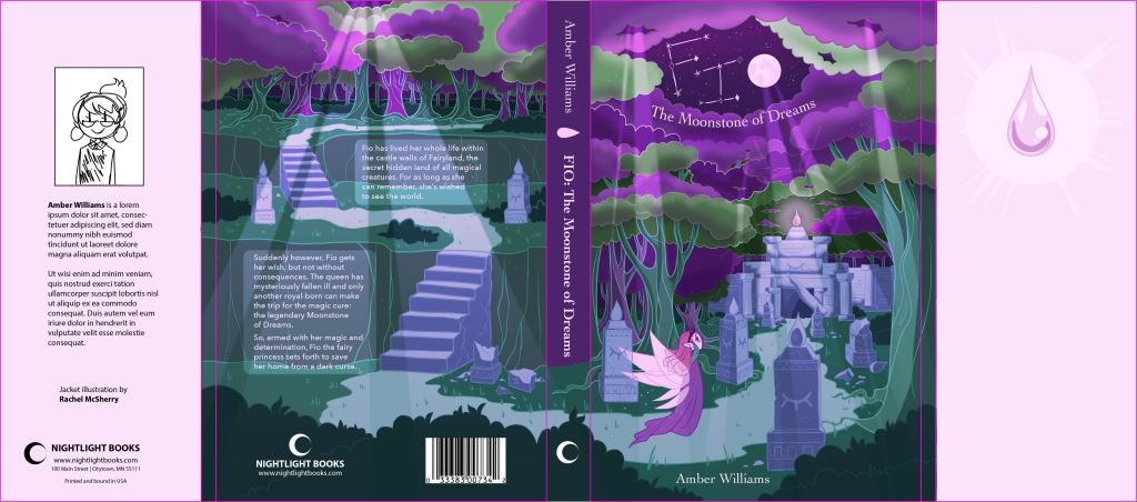 This book is the first in a fantasy series aimed at middle school reading level readers. The story focuses on a fairy princess who sets off to find the mysterious moonstone hidden away in long abandoned forest ruins- as depicted on the front cover.