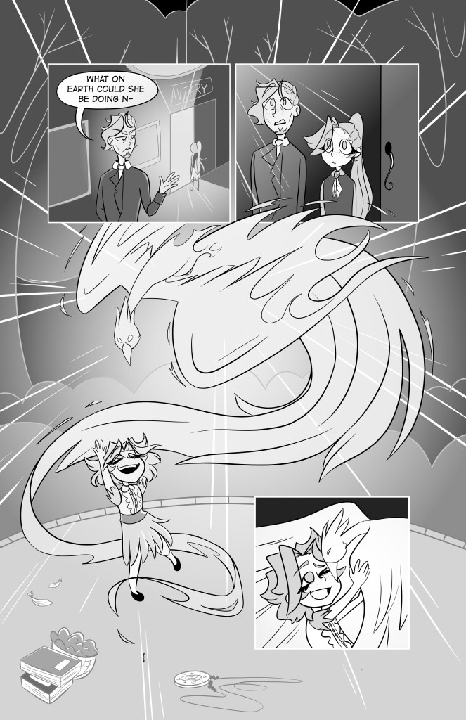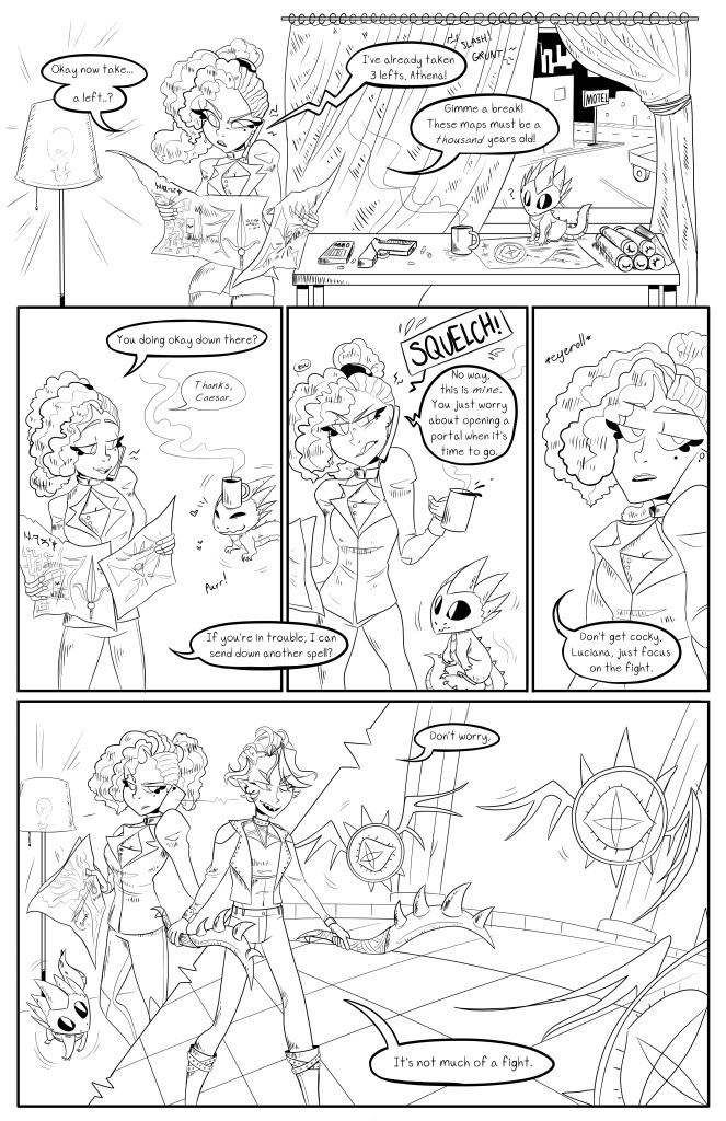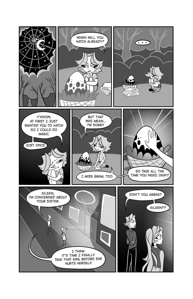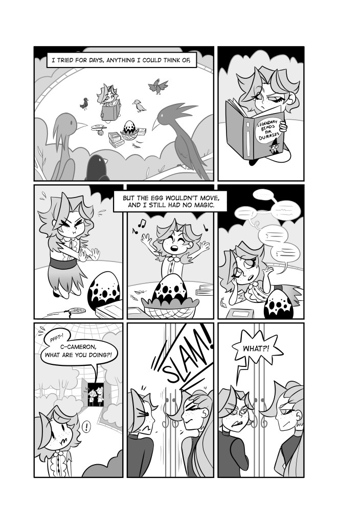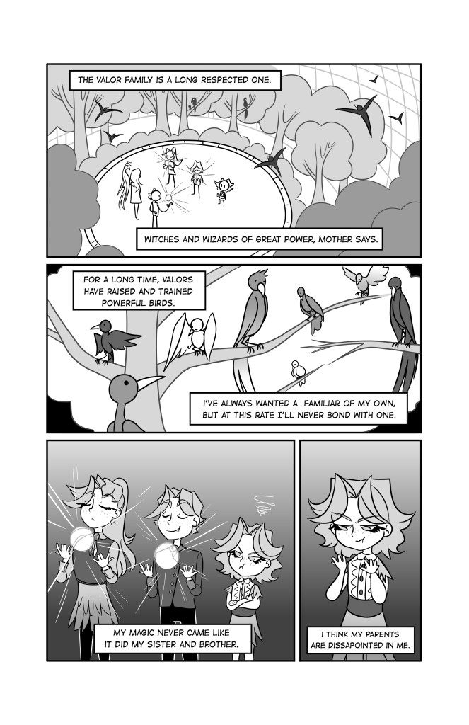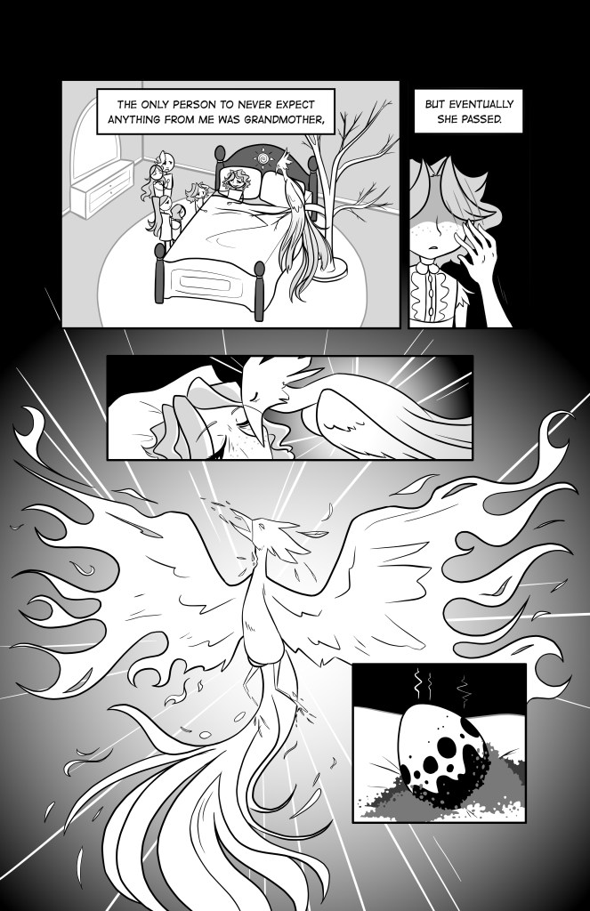 This 6 page, black and white comic is about a young witch girl who comes from a powerful and prestigious magical family. Despite her heritage, however, youngest sister Cameron can’t seem to do any magic and struggles with falling behind her gifted siblings. After their grandmother passes, the family is tasked with passing on her familiar, a phoenix, and Cameron is determined to prove herself.