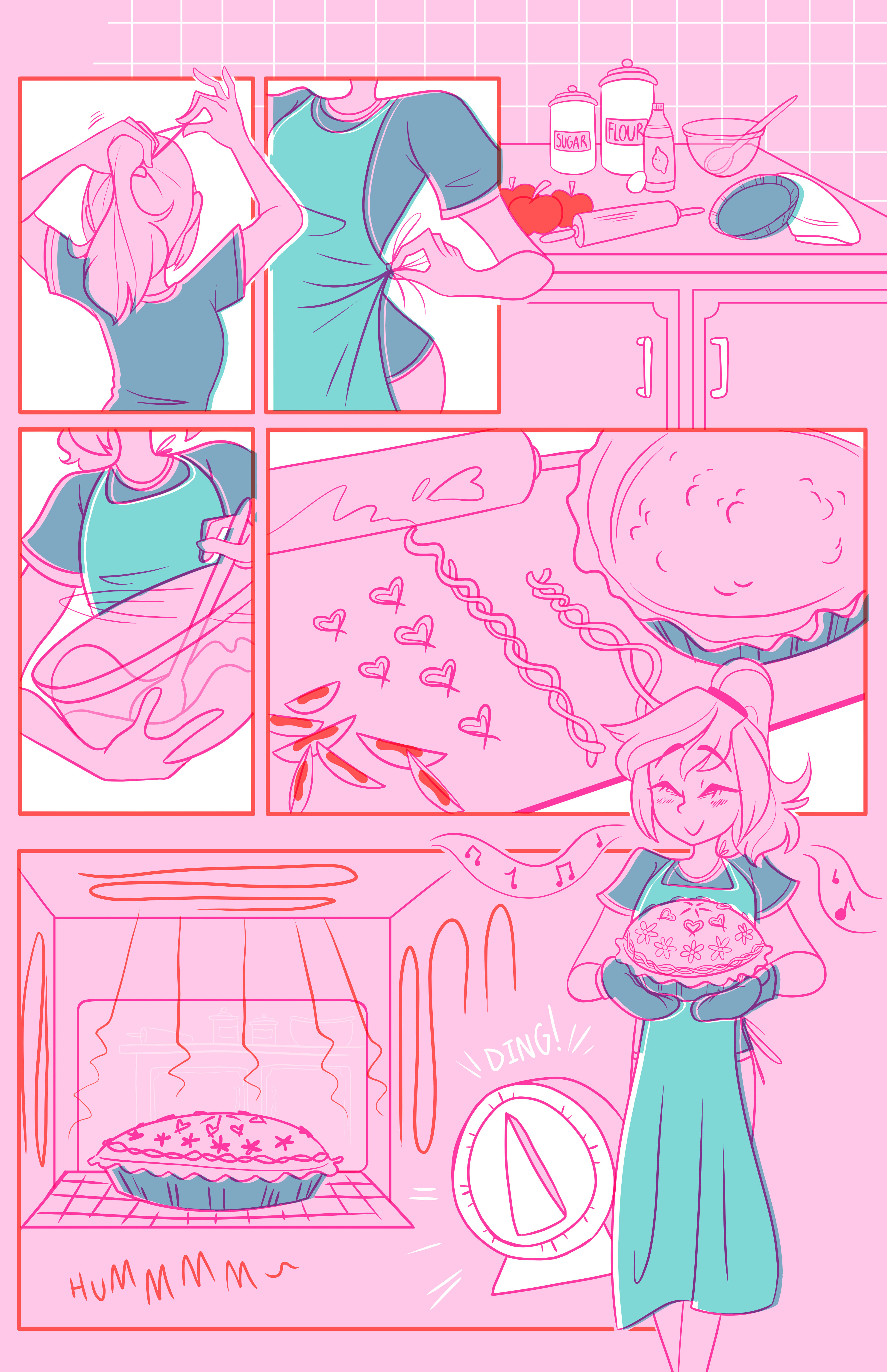 Baker’s Glee, is a silent, 1 page comic about a young woman baking an apple pie and the steps she takes to make it.