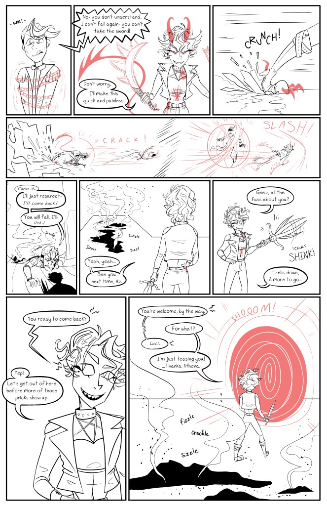 This comic shows off a few of my artistic skills…including my creative writing, use of darker and more violent themes, limited color to enhance composition, interesting and unique character/monster designs, and my understanding of fighting choreography in an otherwise static, comic format.