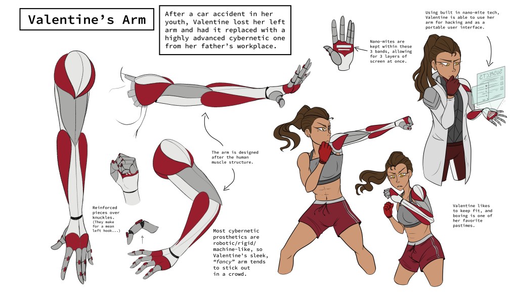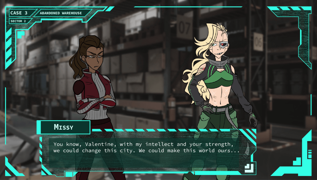 My Cyberpunk Valentine follows prodigy investigator Valentine White and her gruff partner, Creed Blackburn, as they are tasked with hunting down and capturing infamous cybercriminal, The Jackal. As they solve each case, more and more about Valentine’s past is revealed— a life she never knew existed— and a conspiracy that holds the entire city hostage.