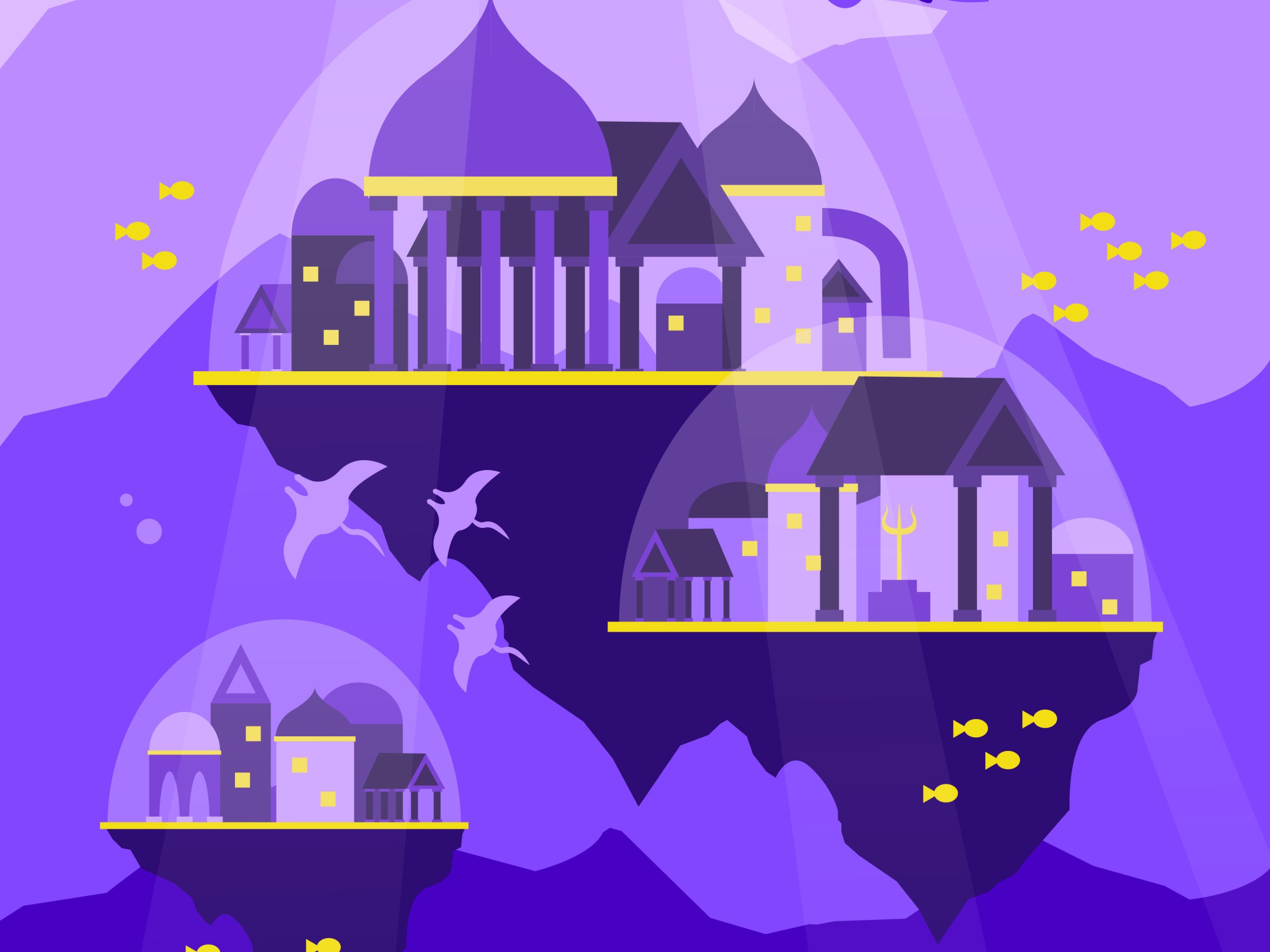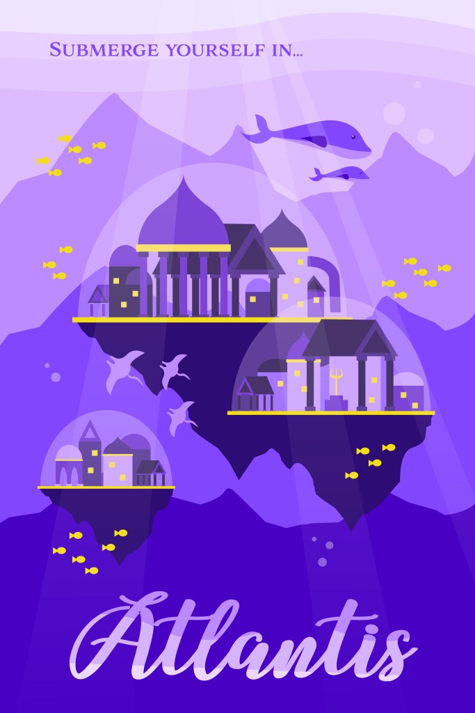 This Atlantis Poster is the first in a fun series I am currently working on. The collection is comprised of travel posters to mythological or fantasy settings. The inspiration for this poster came from my own interest in myth and lore from human history, as well as channeling an inner sense of childlike wonder. Through this influence, I took some imaginative liberties and made the city of Atlantis very much alive, and a floating underwater city protected from the pressure of the sea by large air bubbles.