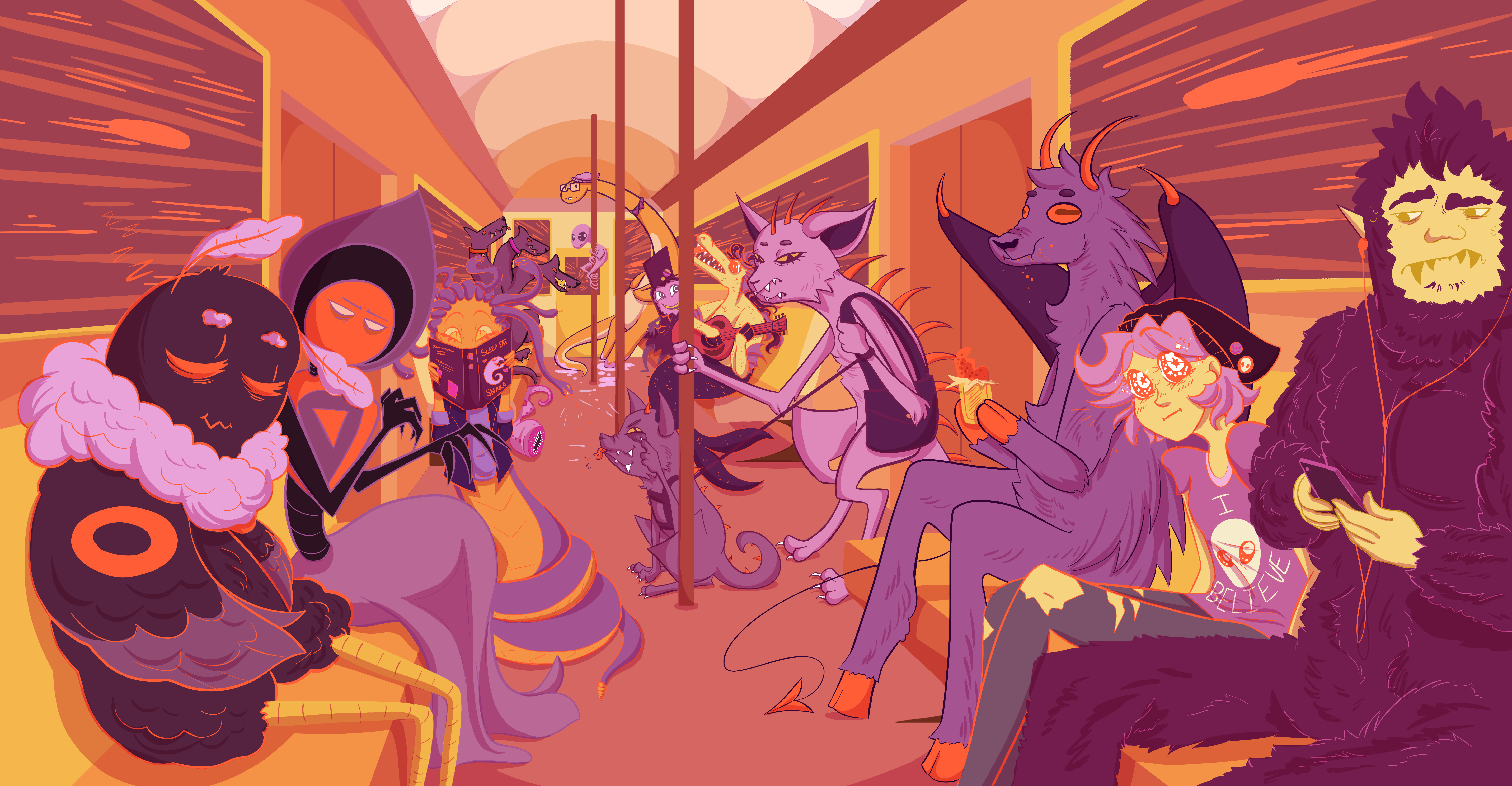 Cryptid Watching is an illustration that pokes fun at the act of people watching. My inspiration was taken from my own family, who love to people watch as well as the strange stories collected from people who have rode public transit every day. Instead of just showing regular city-goers I chose instead to paint them as friendly monsters and cryptids from popular culture. There is only one human girl, sitting mystified by her fellow passengers as she sports an “I Believe” t-shirt. This girl is meant to represent the kind of person who would enjoy the unusual ongoings of public places, such as the subway.
