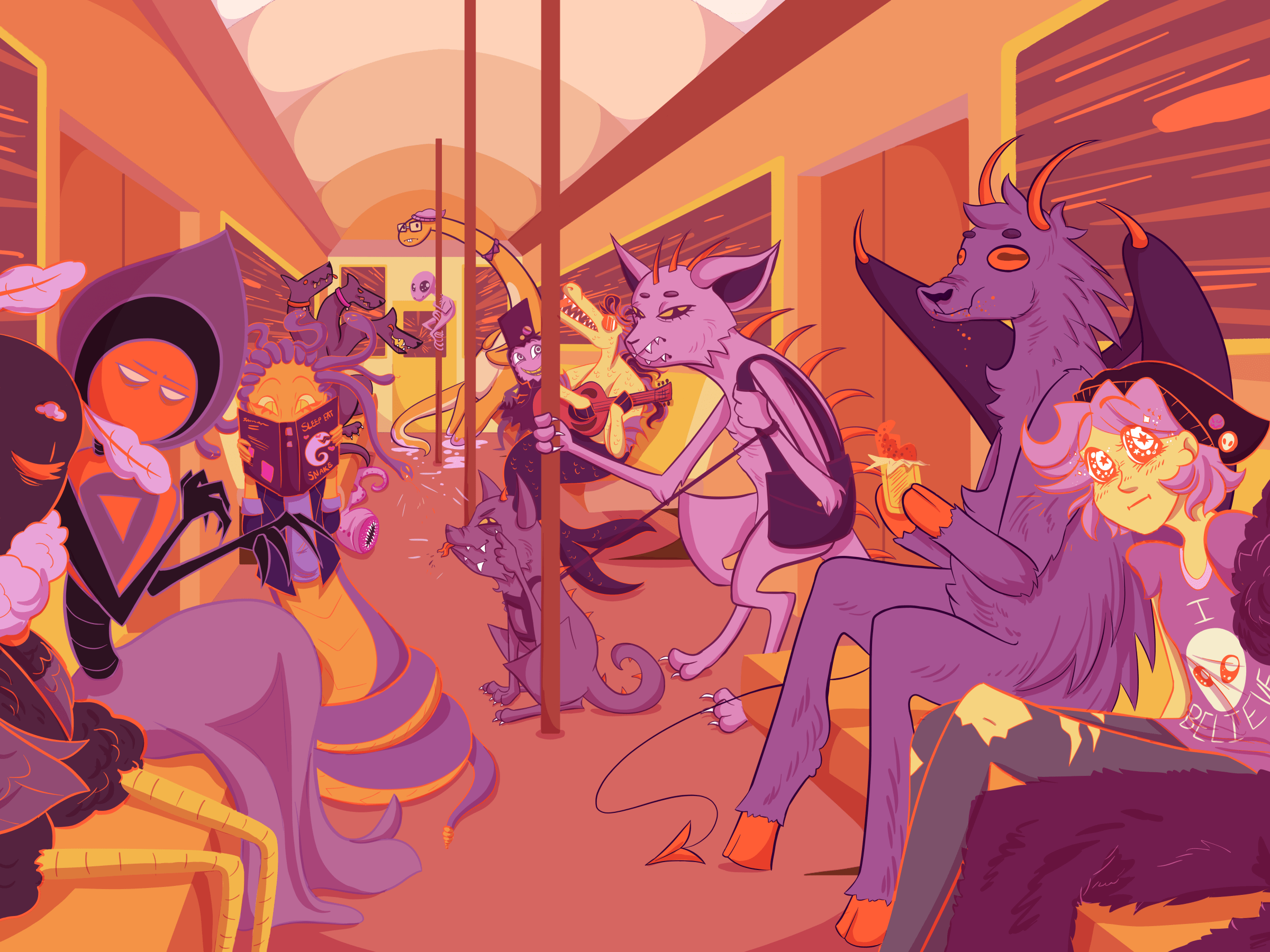 For this illustration I chose to use an energetic palette of reds, oranges and yellows for the background and certain accents. Then, I made the monsters hues of purple. This way, the monsters would be the obvious main subjects and pop effectively against the subway environment.