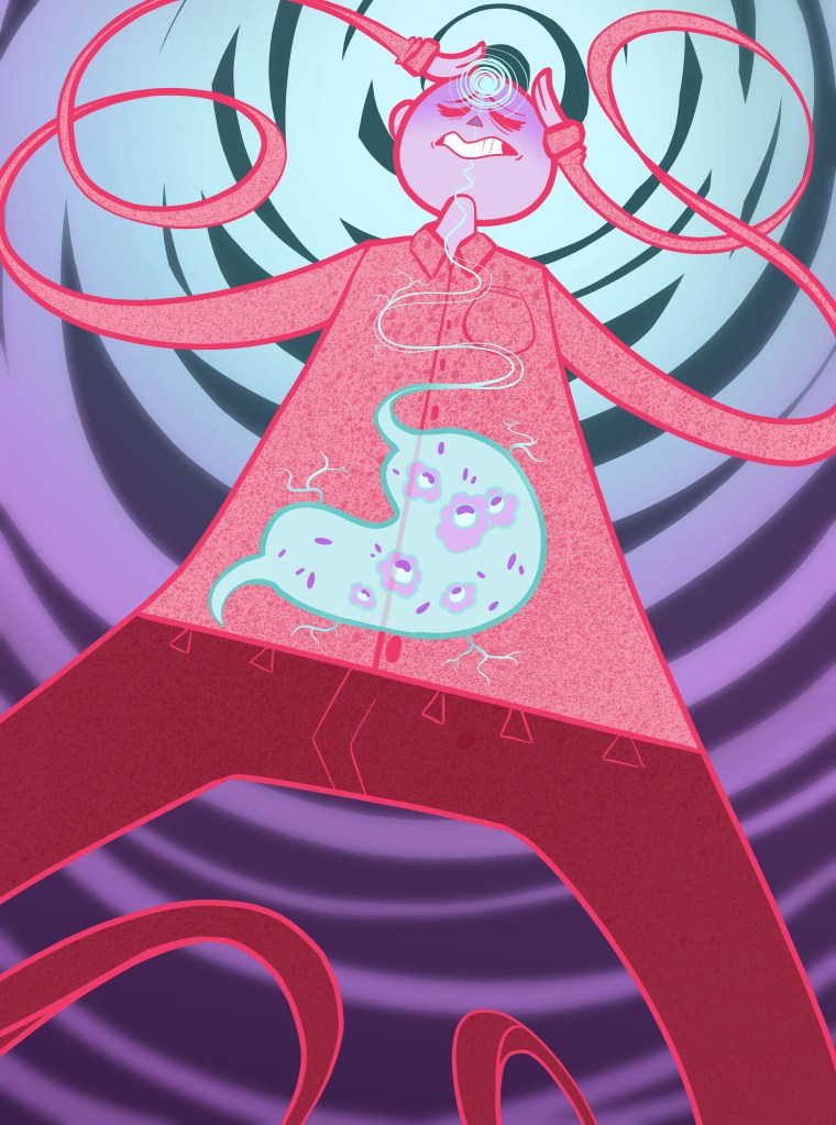 To push the idea of this gut-to-brain connection, I created an extreme perspective and portrayed the gut bacteria as both adorable yet potentially dangerous, all literally connected straight to the brain.