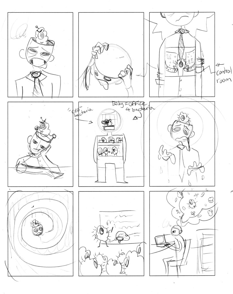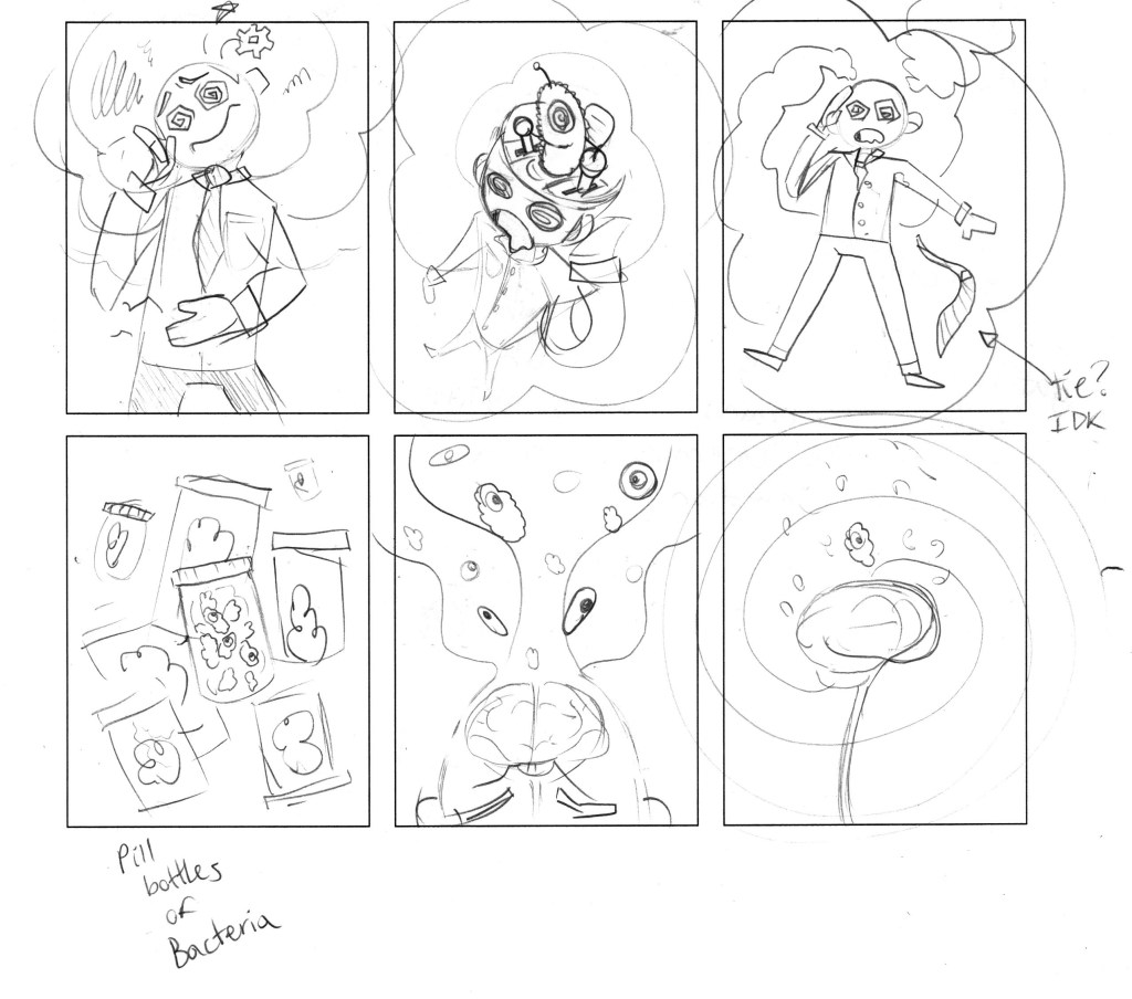 So for my thumbnails and sketches I tried to focus on interesting compositions that would go hand in hand with the medical topics of gut bacteria.