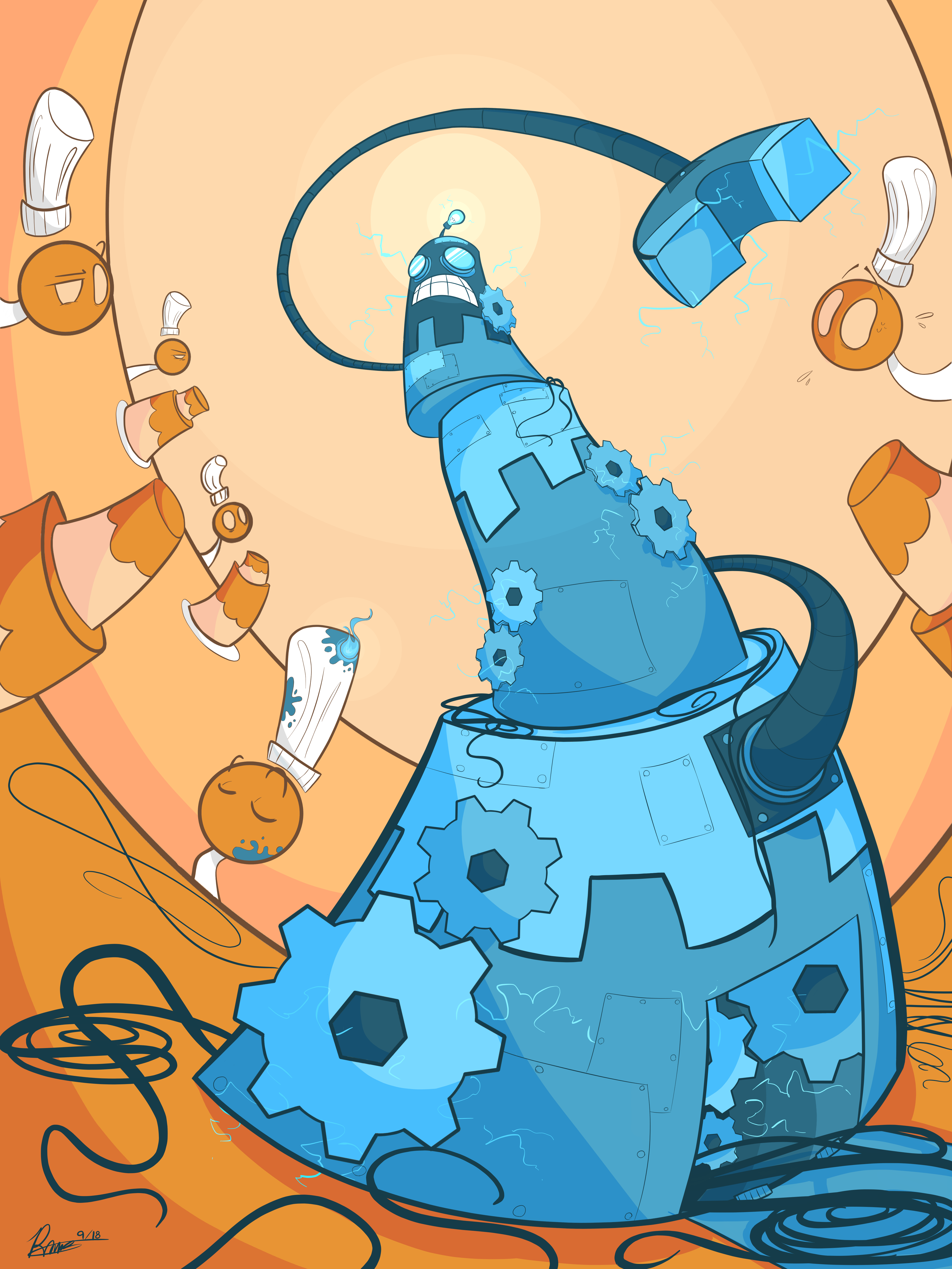 Pretend Cake is a play on a regular baking class with a strange twist. Not every student is alike and this towering robot cake is an extreme example of that. I wished to convey an energy of crazy creativity through the boldness of the machine in contrast to the other regular cakes around it. As a further magnification, I included the simplistic yet expressive bakers each standing next to their respective creation, and giving a reaction of their own.
