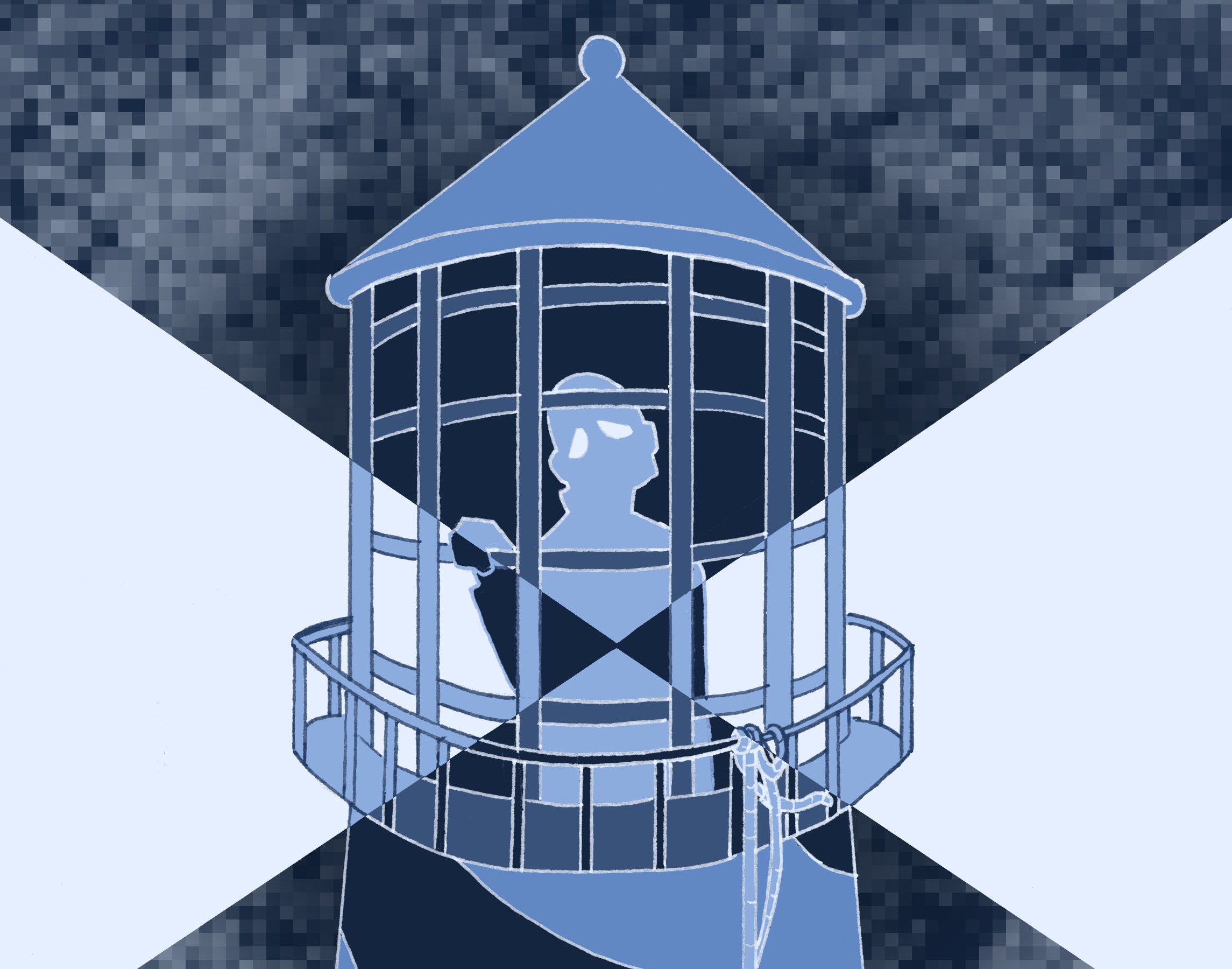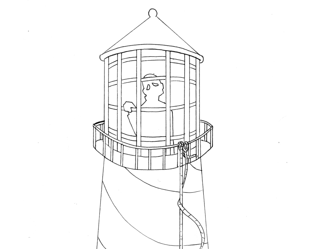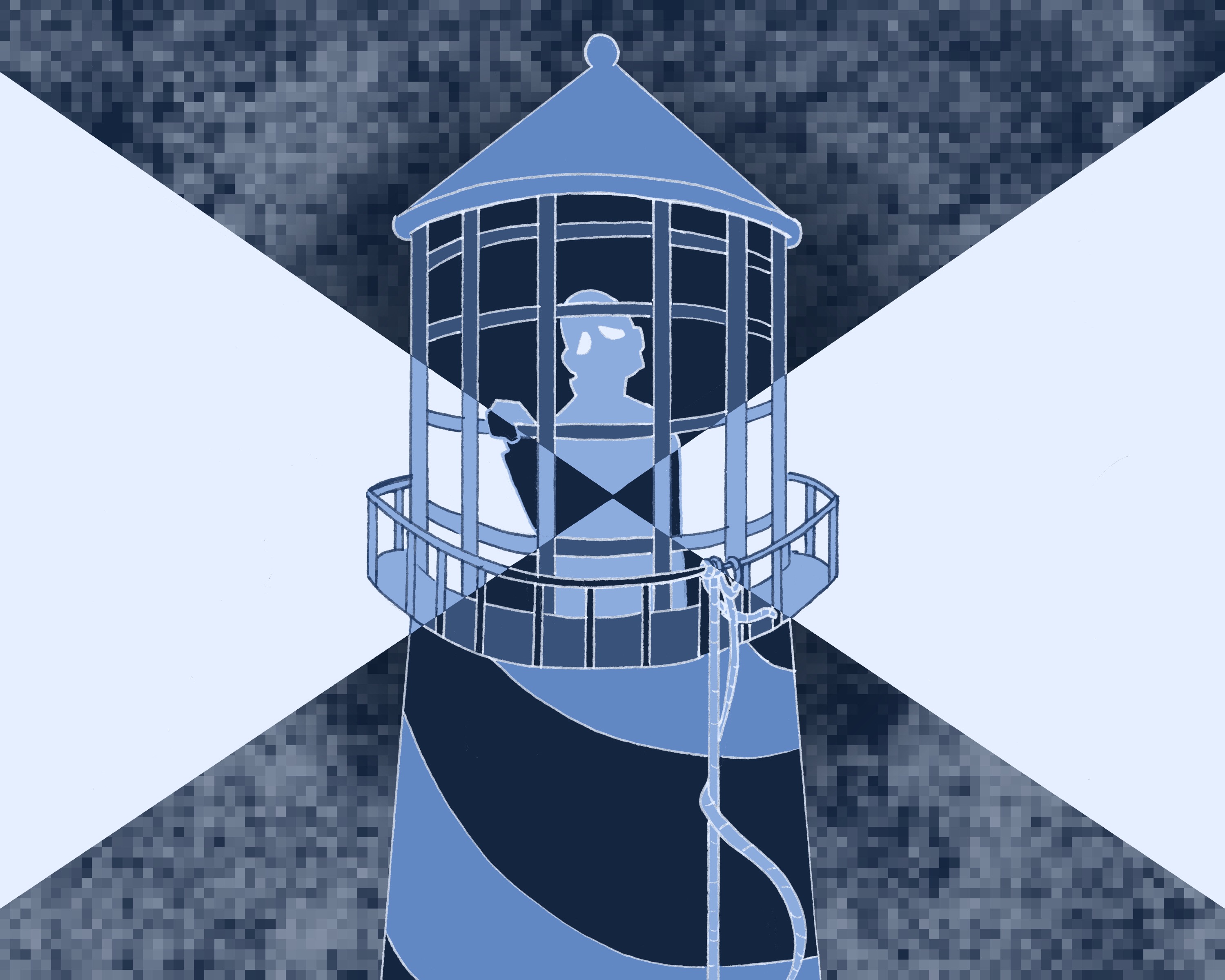 The color palette is cold blues, to call back on the loneliness of winters. The static texture in the background, goes hand in hand with this symbolism- creating a feeling on anxiety. Only the light of the lighthouse functions in a positive way, steering away the darkness, and reminding the keepers of their important jobs. The man inside the lighthouse’s cage-like top looks out towards the viewer, isolated but continuously doing his job of helping sailors find their way.