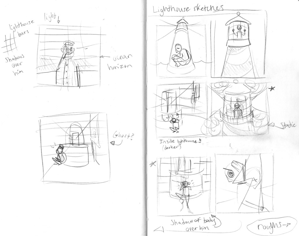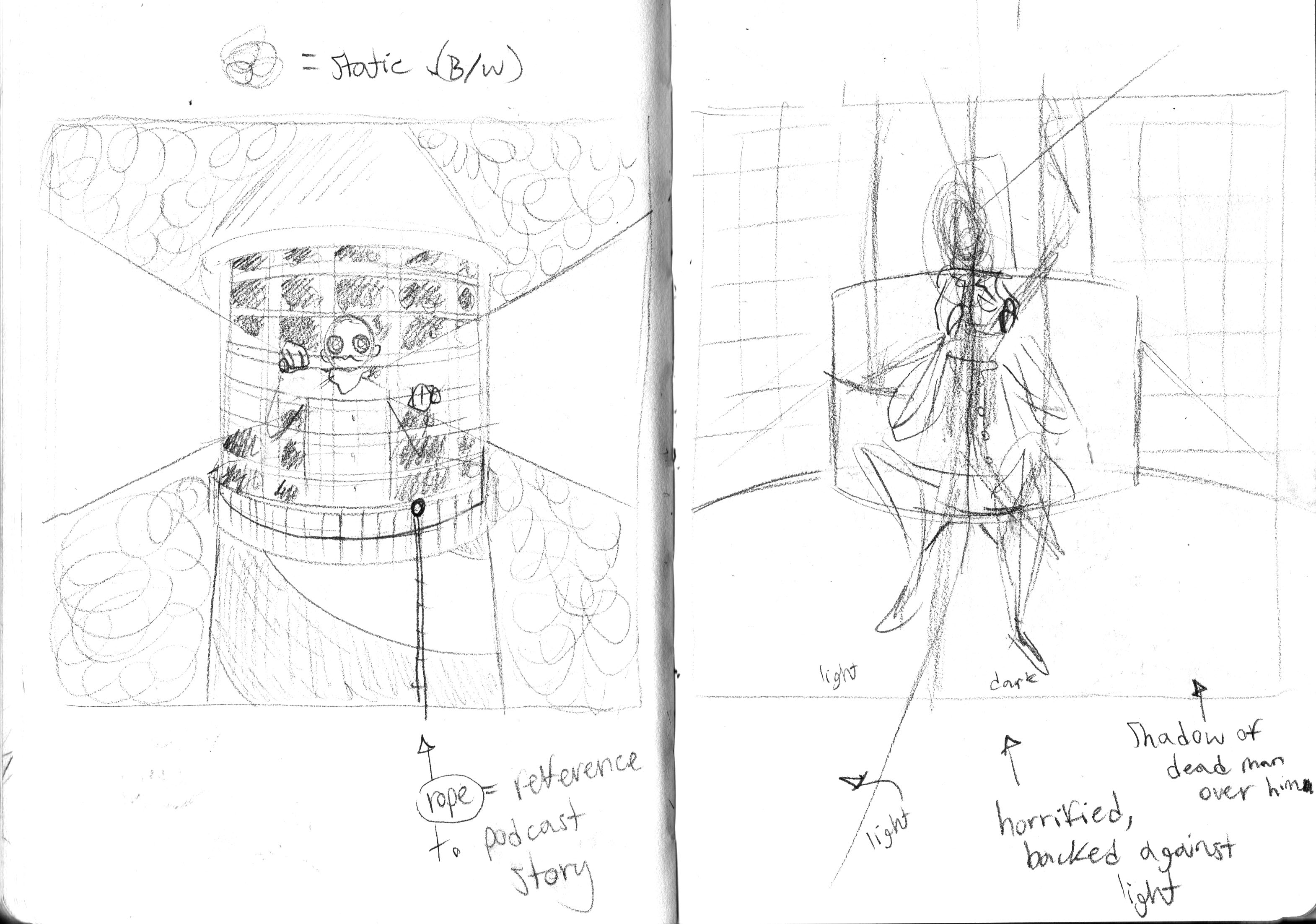 When ideating, I made sketches that touched on the concepts of isolation and the trauma that comes with it. Some ideas are certainly darker than others, considering the subject material, but in the end I decided on more subtle symbolism and a rope over the railing to make reference to the scary-story told in the podcast.